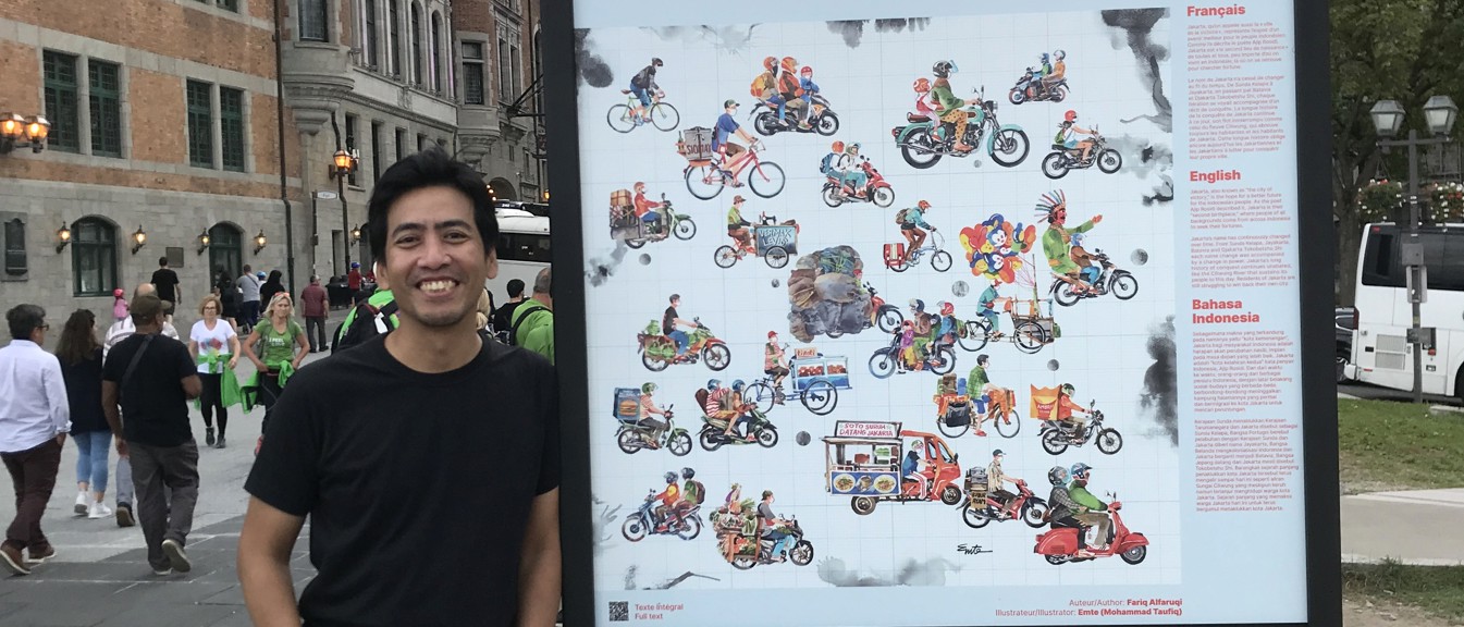 Dans le cadre de l’exposition Toponymie, un artiste issu d’une des villes participantes est venu voir son travail exposé à Québec. Emte est illustrateur à Jakarta, ville de littérature UNESCO (site, Instagram).