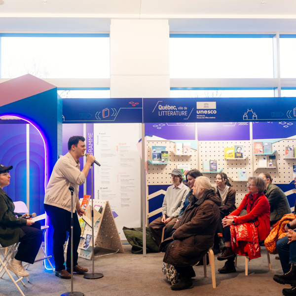 Québec, ville de littérature UNESCO était présente au Salon international du livre de Québec 2025 afin de mettre en lumière le milieu littéraire de Québec et de Wendake. 26 activités ont été présentées durant les cinq jours du salon — micro-performances, entretiens et rencontres, ateliers, séances de signature, matinées famille — dans un décor ludique et invitant, incluant un coin lecture pour découvrir les écrivaines et les écrivains d’ici.