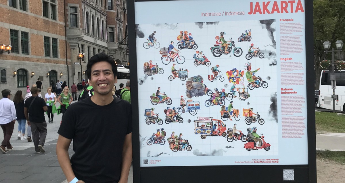 Dans le cadre de l’exposition Toponymie, un artiste issu d’une des villes participantes est venu voir son travail exposé à Québec. Emte est illustrateur à Jakarta, ville de littérature UNESCO (site, Instagram).
