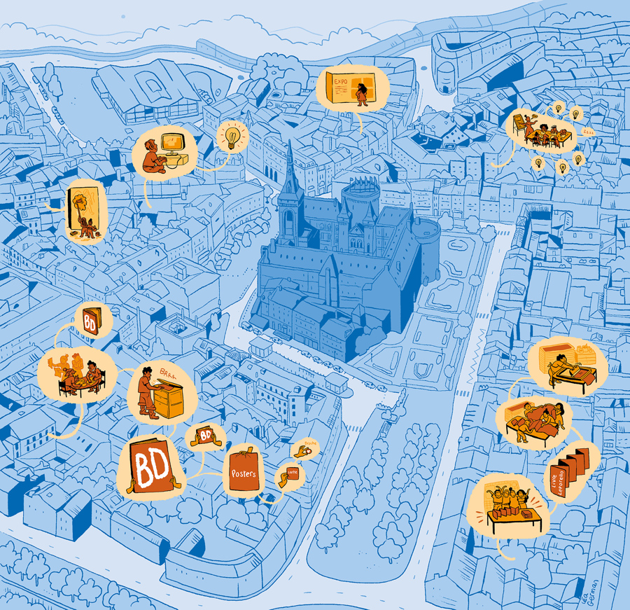 Cut to: World War I. The national powder factory at Angoulême and the de Ruelle cannon foundry are two production centres commissioned by the government. During the period between world wars, Riz La Croix and Le Nil cigarette rolling papers become known worldwide! A jumble of events during World War II: Angoulême becomes part of the occupied zone when SS officers arrive from Paris on June 28, 1940. On August 20, 1940, “convoy 927” departs the Angoulême train station carrying Spanish Republicans towards Nazi extermination camps. On October 8, 1942, 422 Jews are arrested and deported. Let’s skip over Les Trente Glorieuses (The Glorious Thirty) and into 1974, when Angoulême hosts the first Comics Festival! The international comic book capital was named a UNESCO “Creative City” in 2019, and the city has hosted the Cité international de la bande dessinée et de l’image since 2008. A pedestrian bridge over the river Charente links the Chais Magelis to the Vaisseau Moëbius, and the old city is home to La Maison des auteurs. Angoulême becomes a major hub for creators of all things related to the image; it is the site of several schools and training programs. In 2023, Angoulême is hosting the 51st edition of the Circuit des Remparts and the 16th Francophone Film Festival. This dreamy city with an extraordinary history, nicknamed the “balcony of the Southwest” and featured in Honoré de Balzac’s Lost Illusions, would gladly adopt this quote from Stéphane Mallarmé: “If you wish we will love each other/With your lips without saying it”!