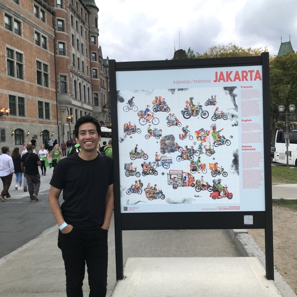 Emte est artiste visuel à Jakarta, ville de littérature UNESCO. Il a réalisé l'illustration pour le segment de cette ville dans l'exposition Toponymie et est venu voir le résultat sur place, à Québec, en octobre 2023. Nous avons pu lui parler de son art et de son parcours.